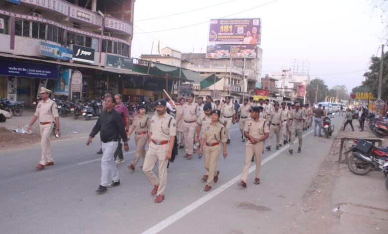 सारंगढ़-बिलाईगढ़, 2 मार्च 2026/होली से पहले कलेक्टर डॉ संजय कन्नौजे एवं पुलिस अधीक्षक की अगुवाई में जिला मुख्यालय सारंगढ़ में सिटी कोतवाली थाना से भारत माता चौक, नंदा चौक मुख्य बाजार होते हुए तुर्की तालाब तक फ्लैग मार्च निकाला गया, जो होली पर्व को परम्परा अनुसार शांति, सदभावपूर्वक, कानून व्यवस्था, सामाजिक और नागरिक सुरक्षा को ध्यान में रखकर मनाने की सीख देता है। इस दौरान फ्लैग मार्च में राजस्व और पुलिस के अधिकारी कर्मचारी उपस्थित थे।