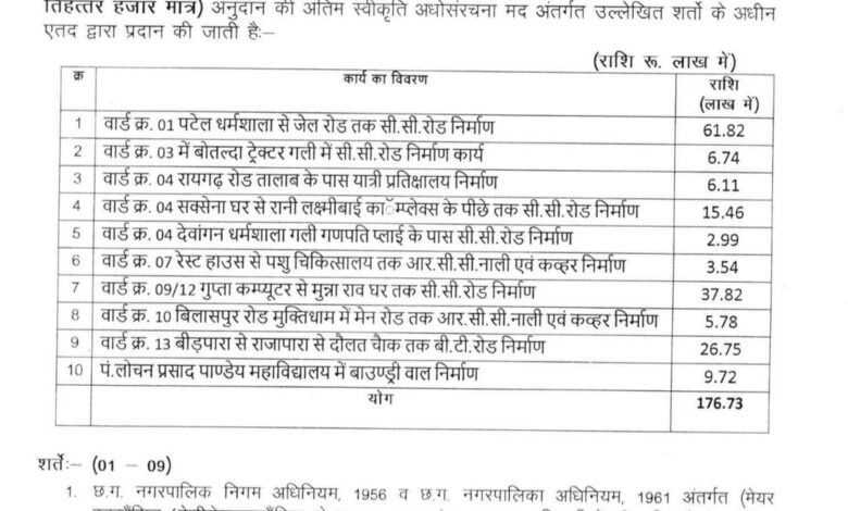 सारंगढ़ नगर पालिका में पटेल धर्मशाला से जेल रोड तक सड़क निर्माण सहित दस निर्माण कार्यों के लिए 176 लाख रुपए की स्वीकृति
